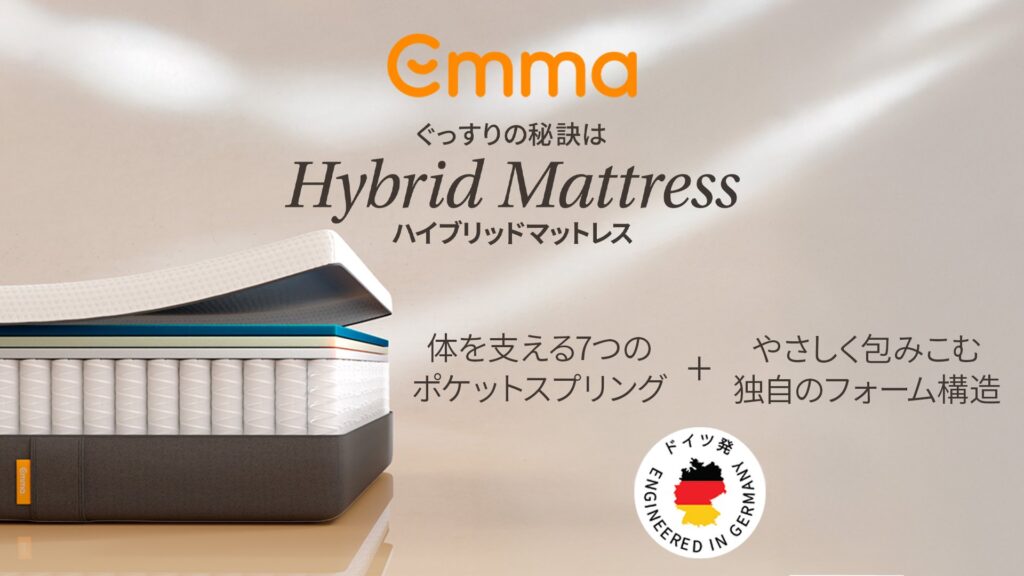 エマスリープは、世界中で愛用されている高品質マットレスブランドで、体圧分散とフィット感のバランスに優れた設計が特徴です。複数のウレタンフォームを組み合わせた多層構造により、体のラインにしっかりフィットしながらも沈み込みすぎない絶妙な寝心地を実現しています。特に肩や腰など負担がかかりやすい部位を均等に支えるため、長時間寝ても疲れにくい設計になっています。また、通気性にも優れており、蒸れにくく快適な睡眠環境を保てる点も魅力です。さらに、長期間のトライアル制度があるため、自宅でじっくり試せる安心感も支持されています。初めて高品質マットレスを導入する方にもおすすめできるバランス型の一枚です。