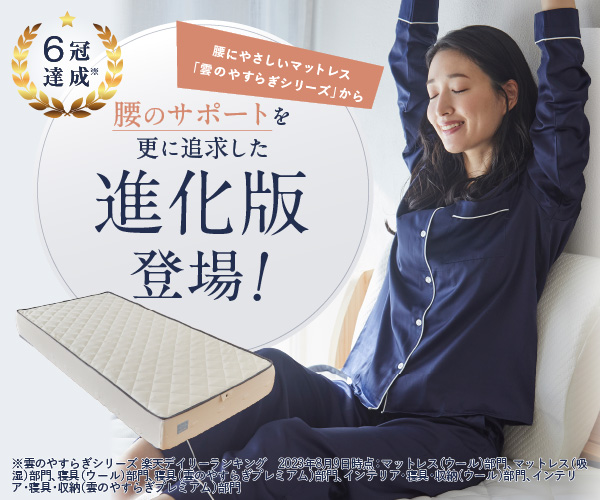 雲のやすらぎプレミアムは、体圧分散性能の高さが際立つマットレスで、特に「体が痛い」「朝起きると重い」と感じる方に向いています。極厚構造による安心感は非常に高く、包み込まれるような寝心地を求める方には最適です。ただし、寝返りのしやすさという点ではモットンの方が優れているため、「寝返り改善」を重視する場合は1位がおすすめです。それでも体圧分散重視の方には非常に有力な選択肢となります。